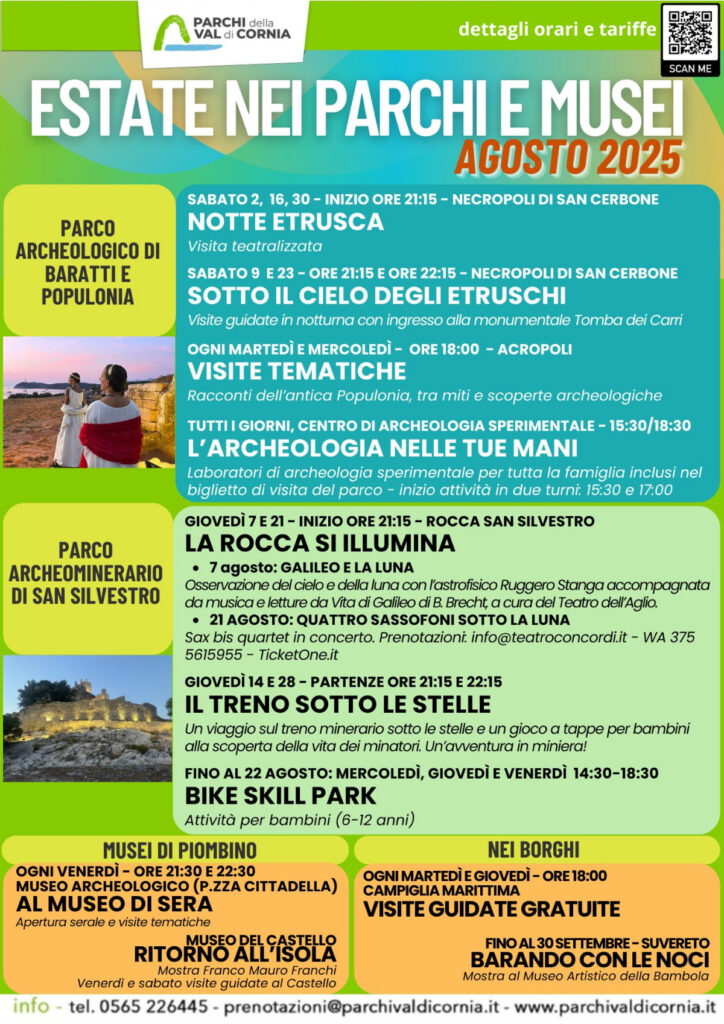 Apertura serale e visite tematiche con partenze alle ore 21:30 e 22:30, pensate per coinvolgere adulti e bambini con una narrazione immersiva. In calendario: 1 agosto “Tesori dal mare, reperti dalle onde e da terre lontane”, 8 e 29 agosto “Capolavori dal Museo”, 15 agosto “Il naufragio di un mondo. L’anfora argentea di Baratti”, 22 agosto “La Collezione Mascìa, un viaggio dall’Egitto ai Romani”. - Museo del Castello