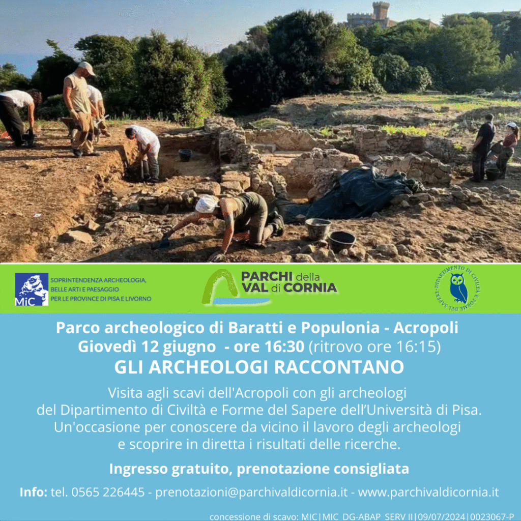 Giovedì 12 giugno, alle 16:30 (con ritrovo alle ore 16:15) è previsto il primo appuntamento di quest’anno con “Gli archeologi raccontano”, un pomeriggio dedicato alle novità emerse: una nuova occasione per conoscere da vicino il lavoro degli archeologi e per scoprire particolari e curiosità su come si vivesse tra II e I secolo a.C. a Populonia.