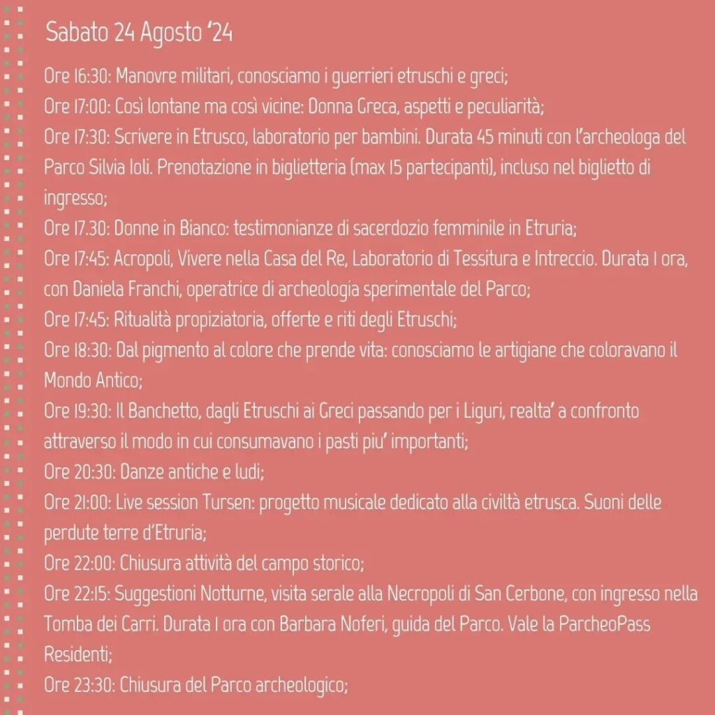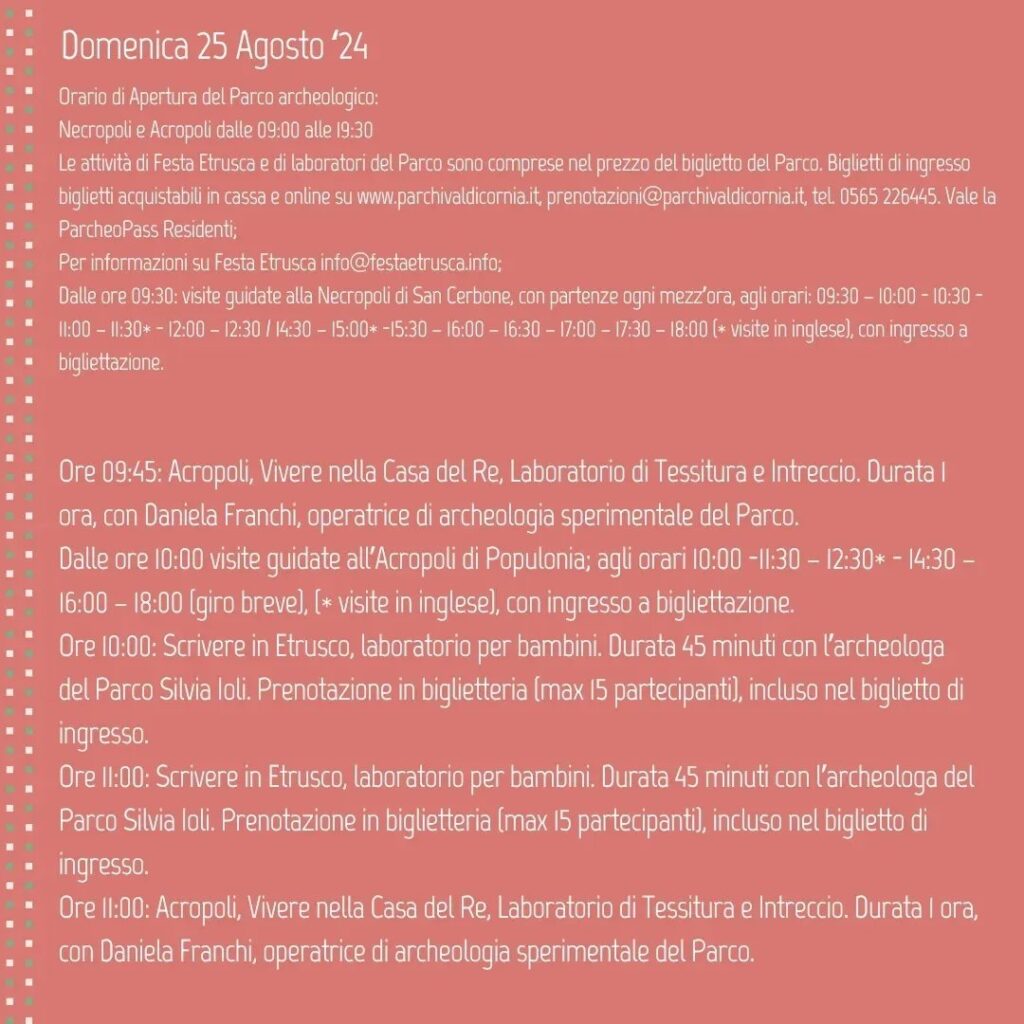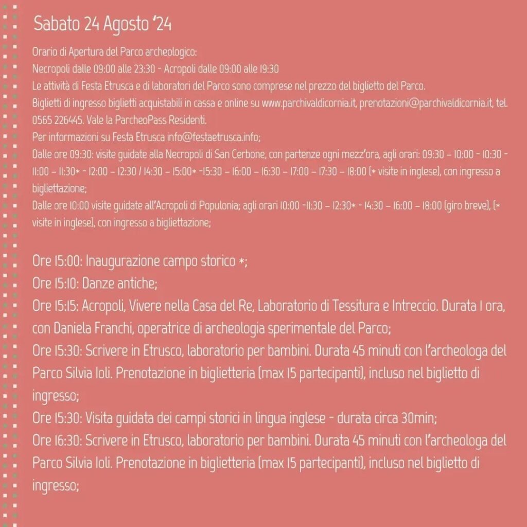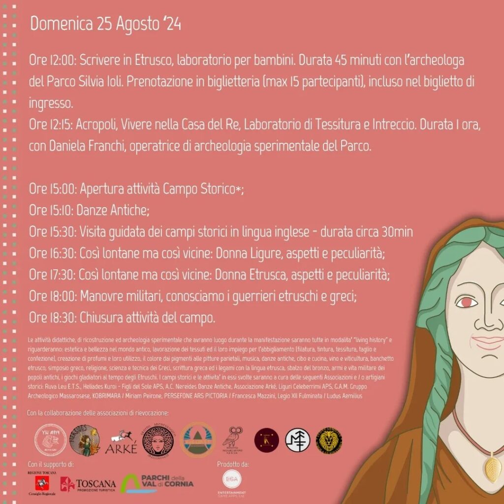 In occasione delle Giornate degli Etruschi 2024, il Parco archeologico di Baratti e Populonia ospiterà la terza tappa di Festa Etrusca, la manifestazione itinerante, realizzata da Entertainment Game Apps, Ltd., con il supporto di Toscana Promozione Turistica e Regione Toscana, che coinvolge i visitatori alla scoperta del popolo etrusco, con laboratori didattici, allestimenti scenici e rievocazioni. “Festa Etrusca – La Storia si Racconta” approda al Parco sabato 24 e domenica 25 agosto andando ad offrire momenti didattici, musica, laboratori e visite guidate per far conoscere gli usi e i costumi dell’antico popolo.